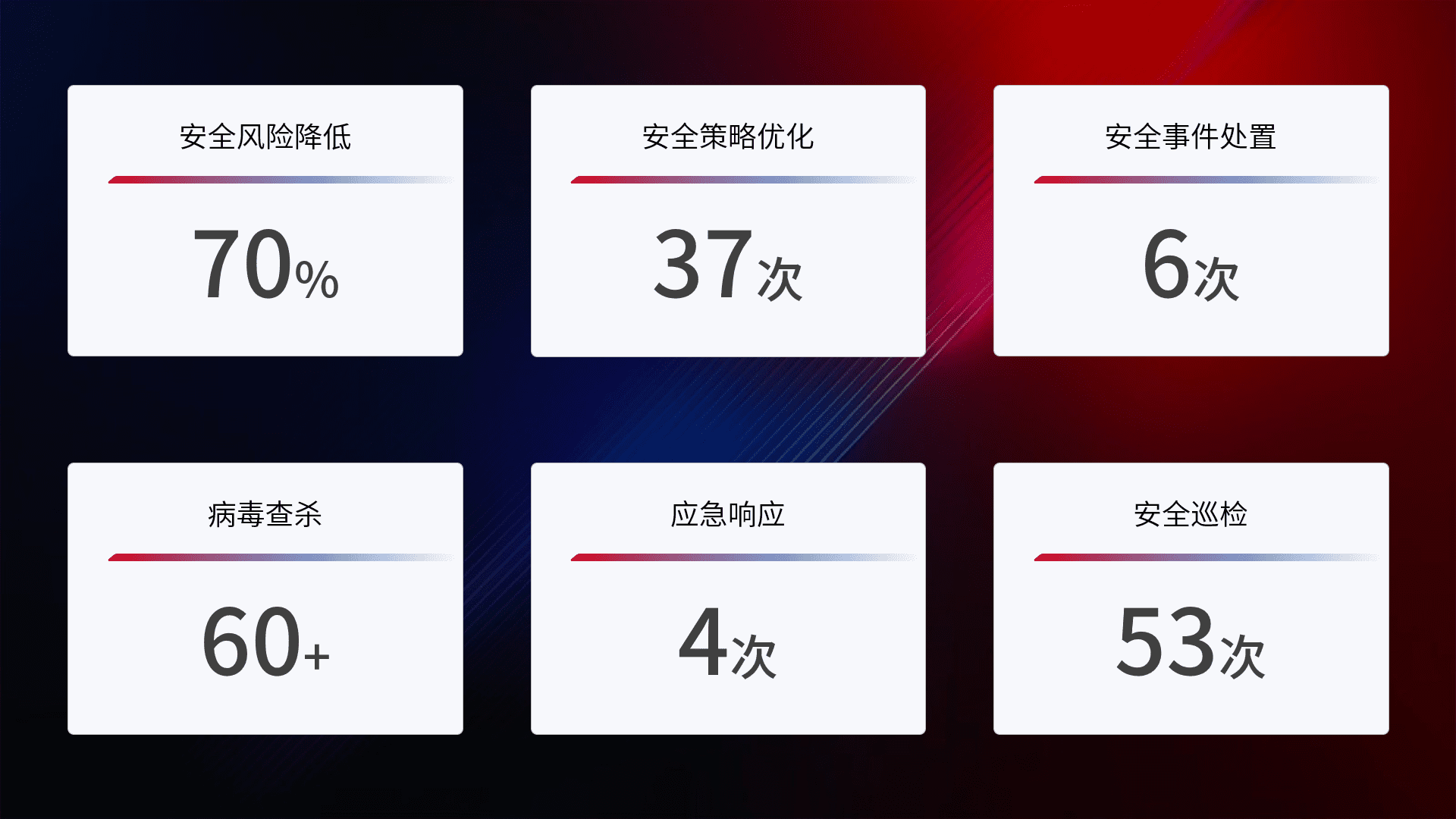 提供全面的安全事件报告体系,,,,包括处置报告、、、、周报、、季度和年度总结,,,结合持续监控,,帮助客户深入了解网络安全状况。。
