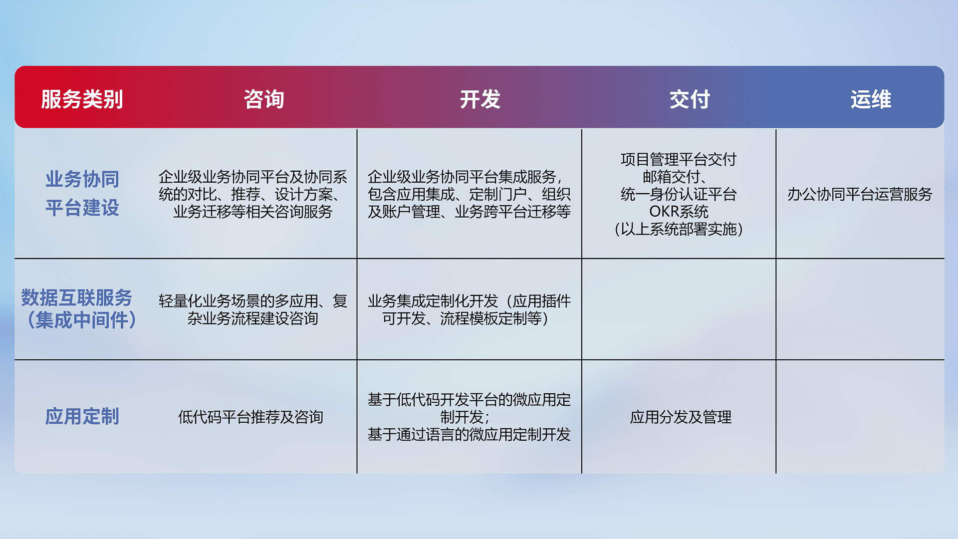 针对钉钉、、、企微、、、IDaas等平台级产品提供产品的规划、、、方案、、交付、、、、定制化开发等服务,,实现如统一协同办公、、智能客户服务、、、、混合会议管理、、、、智能数据查询、、、等业务场景,,,实现数字化转型。。。。